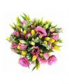 Состав букета:Тюльпаны желтые — 17 шт., Эустома розовая — 28 шт., лента.