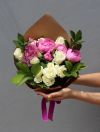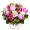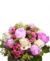 Кустовые розовые розы — 3 шт., пионы— 6 шт., белые розы — 4 шт., питтоспорум — 4 шт..