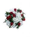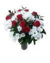 Состав:Красные розы — 12 шт., белая ромашковая хризантема — 5 шт., лента.