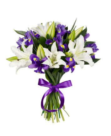 Состав букета:лилий — 4 ветки, синие ирисы — 9 шт.