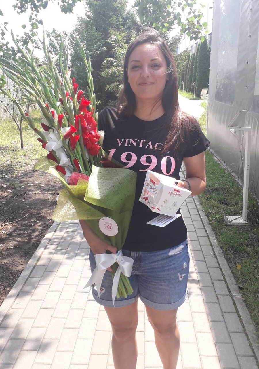 Состав букета:разноцветные гладиолусы - 27 шт., флизелин оранжевый, лента.