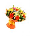 Состав букета:кустовая роза — 5 штук, гербера — 5 штук, альстромерия — 5 штук, танацетум камилла, аспедистра, салал.