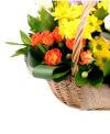 Состав корзины: белые эустомы – 4 шт., желтые хризантемы – 3 шт., кустовые розы – 4 шт., аспидистра – 4 шт, декор – 5 шт., корзина.