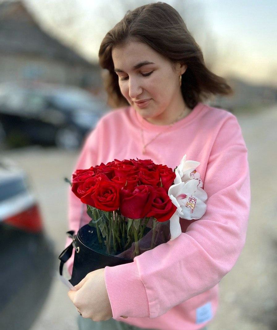 Наша компания предоставляет вам возможность приобрести Шляпную коробку с розами и орхидеей с доставкой всего в несколько кликов благодаря нашей службе доставки.