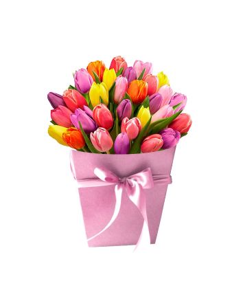 Состав коробки:тюльпаны разноцветные — 31 шт., коробка — 1 шт., лента.