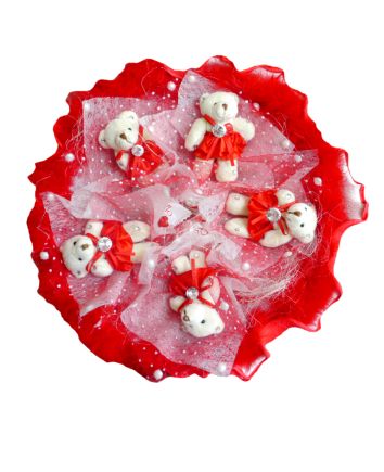 Сomposition:5 bears, candy Raffaello, organza, satin ribbon. Height - 35 cm, circumference-32 cm