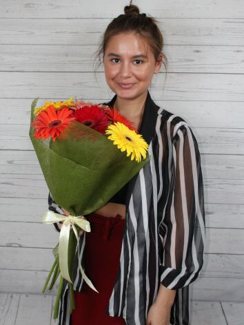 The bouquet composition:Gerberas different colors — 7 pcs., Leaves pistachios — 3 pcs..