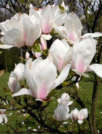 The bush grows 4 m tall and has a compact crown of 3x3.5 m. It grows slowly, blooms simultaneously with the appearance of leaves (May). The flowers are white, with a diameter of 7-8 cm. Petals 6, are white, on the outside with a small purple spot.