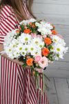 Состав букета:Кустовая роза – 9 шт, хризантема – 7 шт, рускус – 3 шт.