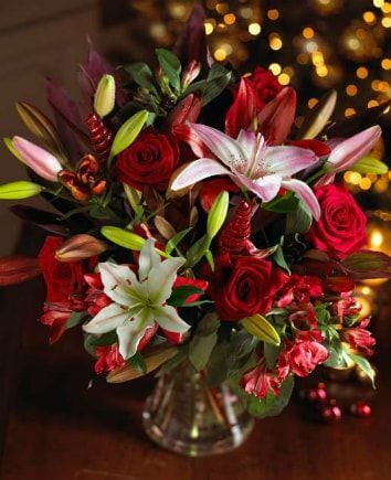 Состав букета: Азиатские лилии — 5 ветви, Альстрёмерии красные — 5 ветви, Розы красные — 9 шт., Украшения, Лента.
