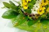 - Хризантемы – жёлтые, зелённые, белые, дополнительный декор, декоративные бабочки, корзина.
