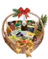Compoziția din coș:ananas – 1 buc., struguri albi, brânză feliată “KOMO” (ambalat în vid) – 2 buc., salam feliat “Carmez” (ambalat în vid) – 2 buc, cașcaval «Camembert» – 1 buc, cașcaval «Grand blue Danish» – 1 buc, ciocolată "Griliaj Bucuria”, 200 gr. – 1 buc., ciocolata neagra Roshen – 1 buc., icre de somon (în sticlă) 200 gr – 1 buc., divin "DIVIN KVINT" 10 ani – 1 buc, ceai "LIPTON FOREST FRUIT" negru – 1 buc, cafea "NESCAFE GOLD" instant, 70 gr. – 1 buc., cafea "JACOBS MONARCH" instant, 95 gr. – 1 buc., vin spumant "CRICOVA" demidulce, 750 ml. – 1 buc., șprote "RIGA Gold" în ulei, 125 gr. – 2 buc, decor.