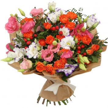 Compoziția buchetului:Miniroza - 7 buc, eustoma - 10 buc, Hypericum - 5 buc, fistic - 5 buc.