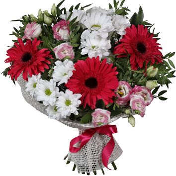 Compoziția buchetului:Gerbera – 3 buc., crizanteme – 2 buc., eustom - 2 buc., fistic-2 buc., ruskus-2 buc.
