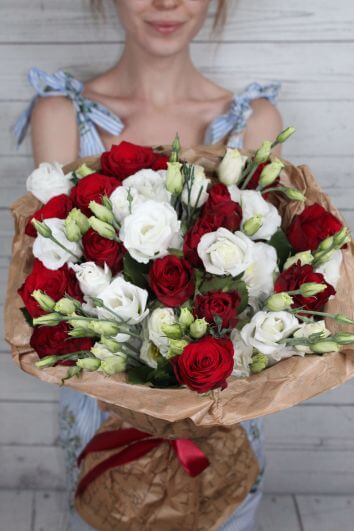 Trandafiri roșii — 10 buc., eustome — 5 buc., panglică, hirtie kraft.