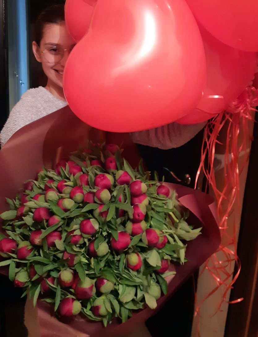 Compozitie buchet:Bujori bordo — 55 buc., panglică,