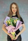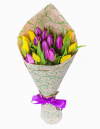 Compozitie buchet:Lalele galbene și lila — 15 buc., panglică.