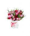 Compozitie buchet:Lalele roz și roșii — 51 buc., Bear Grass — 15 buc., ambalaj, panglică,