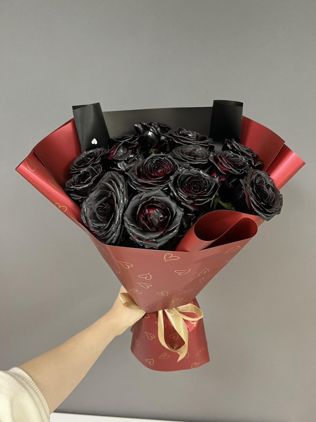 Compozitie buchet:Trandafiri negri — 21 buc., panglică.