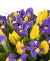 Compoziție buchet:Lalele galbene — 20 buc., Iriși — 15 buc., Panglică.