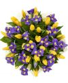 Compoziție buchet:Lalele galbene — 10 buc., Iriși — 5 buc., Panglică.