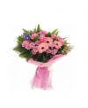 Compozitie buchet: trandafiri roz — 7 buc., iris — 9 buc., gerbera — 5 buc., crizanteme — 7 buc.