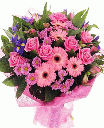 Compozitie buchet:trandafiri roz — 5 buc., iris — 6 buc., gerbera — 3 buc., crizanteme — 5 buc.