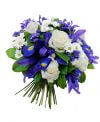 Compozitie buchet:trandafiri albi — 10 buc., irisi — 12 buc., crizanteme — 9 buc..