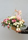 Compozitie coș:Trandafiri albi — 10 buc., Trandafiri roz — 7 buc., Lalele albe — 12 buc., Lalele roz — 12 buc., Orhidee roz — 4 buc., Aspidistra — 5 buc., Gypsophila — 5 pcs..