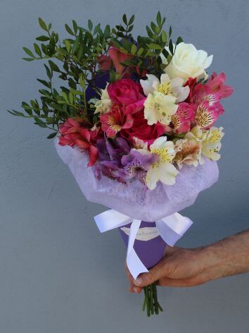 Compoziția buchetului:trandafir alb – 2 buc, trandafir roz – 4 buc, eustom - 5 buc, Alstromeria – 2 buc.