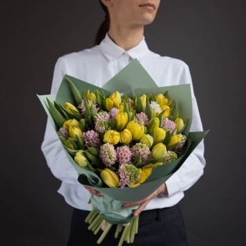 Compoziția buchetului:zambile - 29 buc, lalele - 30 buc.
