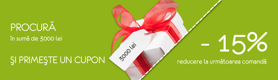 Fiecare client, la comenzi de cel puțin 3000 de lei ,primește un cupon cadou 15% reducere pentru următoarea comandă
